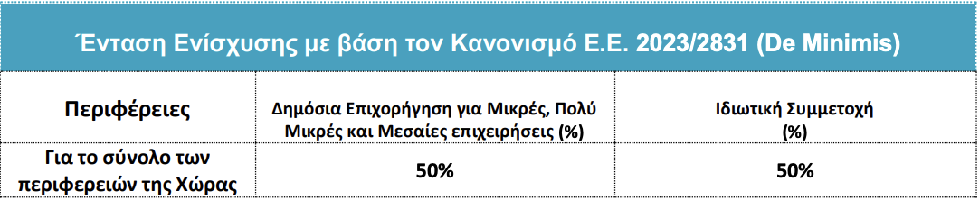 Οι ενισχύσεις της παρούσας Δράσης θα διατεθούν στο πλαίσιο του Κανονισμού (ΕΕ) 2023/2831(OJ EL L 15.12.2023) της Επιτροπής της 13ης Δεκεμβρίου 2023 σχετικά με την εφαρμογή τωνάρθρων 107 και 108 της Συνθήκης για τη λειτουργία της Ευρωπαϊκής Ένωσης στις ενισχύσειςήσσονος σημασίας (De Minimis).Το ποσοστό ενίσχυσης ορίζεται ως εξής: